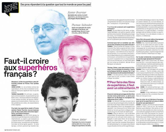 Première publie ce mois-ci un article titré « Faut-il croire aux super-héros français ?« . Avec Simon Astier (Hero Corp), Thomas Salvador (Vincent n’a pas d’écailles) et moi-même (avec la casquette Super-Héros – une histoire française, comme la plupart d’entre vous s’en doutent), on nous a donc réunis pour discuter de la question. Le résultat est cette double page où l’on a empilé nos photos façon Mont Rushmore en les recoloriant.