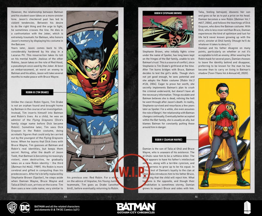 De facto, quand il s’est agît de lister les différents Robins, je n’ai donc pas “simplement” mentionné Dick Grayson, Jason Todd, Tim Drake et Damian Wayne (les quatre versions les plus connues) mais aussi le tout premier Robin (Bruce Wayne lui-même !), Stephanie Brown, Lance Brunner (l’autre fils adoptif de Bruce) ou même Julie Madison. Pourquoi ? Parce si le Club of Heroes est dans la continuité alors Bruce en Robin aussi (ca ne contredit pas forcément l’origine décrite dans Batman Year One, ca s’est juste passé avant). Parce que d’une part cela ouvre des possibilités de scénario (si quelqu’un veut écrire une campagne à l’époque où le jeune Bruce Wayne était un Robin inexpérimenté ou même rajouter quelque chose aux démèlés de Julie Madison vs Clayface, par exemple). Parce que Stephanie Brown en Robin cela permet de baser une partie sur les événements de War Games. Parce que Lance Brunner a une petite importance historique. Et que du coup sa tombe peut devenir elle aussi un élément de scénario (mettons que quelqu’un décide de le venger ou quelque chose du genre). Et qu’en définitive même si vous n’avez rien à faire des différents Robins, les définir permet aussi d’identifier leurs différentes bases à travers la ville et ses alentours. Au pire, vous voulez vous en tenir au Bruce Wayne adulte de Batman Year One, vous avez le choix d’ignorer sa période Robin méconnue. Je suis pour ma part très content que DC/Warner nous ait validé des éléments de continuité si obscurs. Cela fait que les joueurs aurons le choix de s’en servir (ou pas).