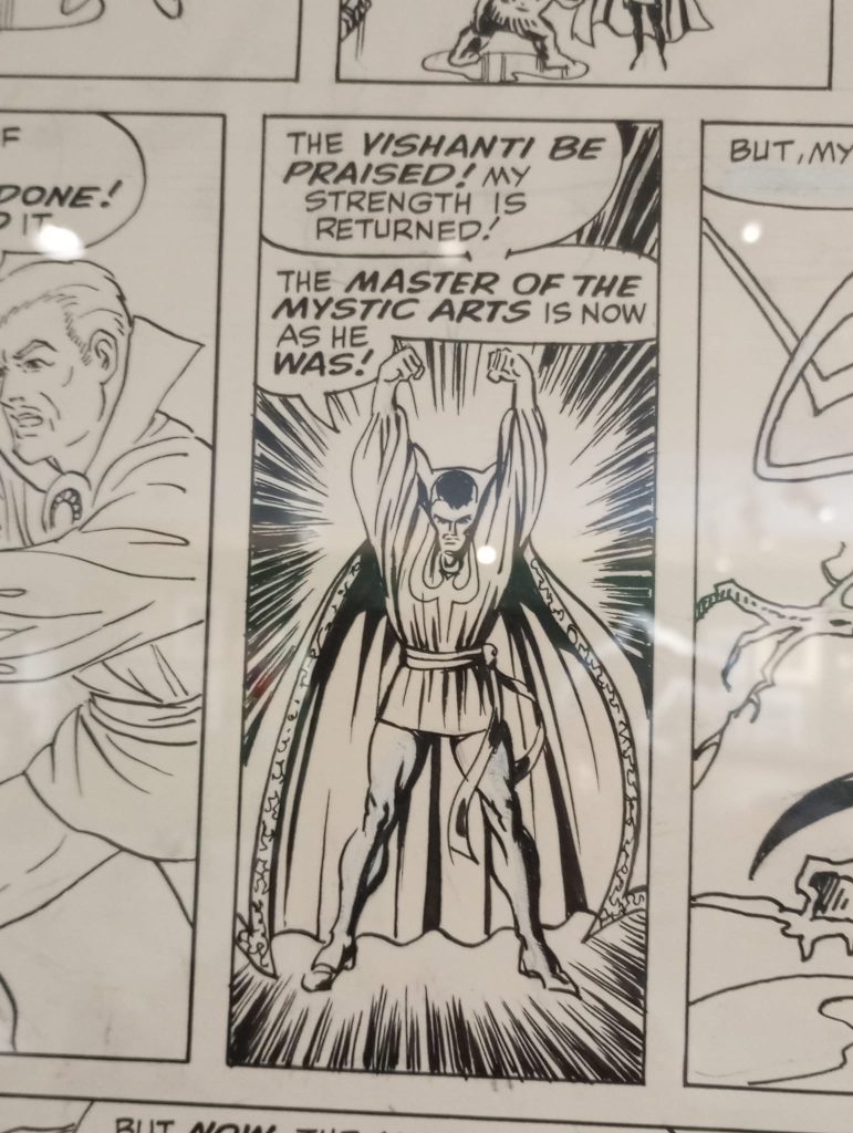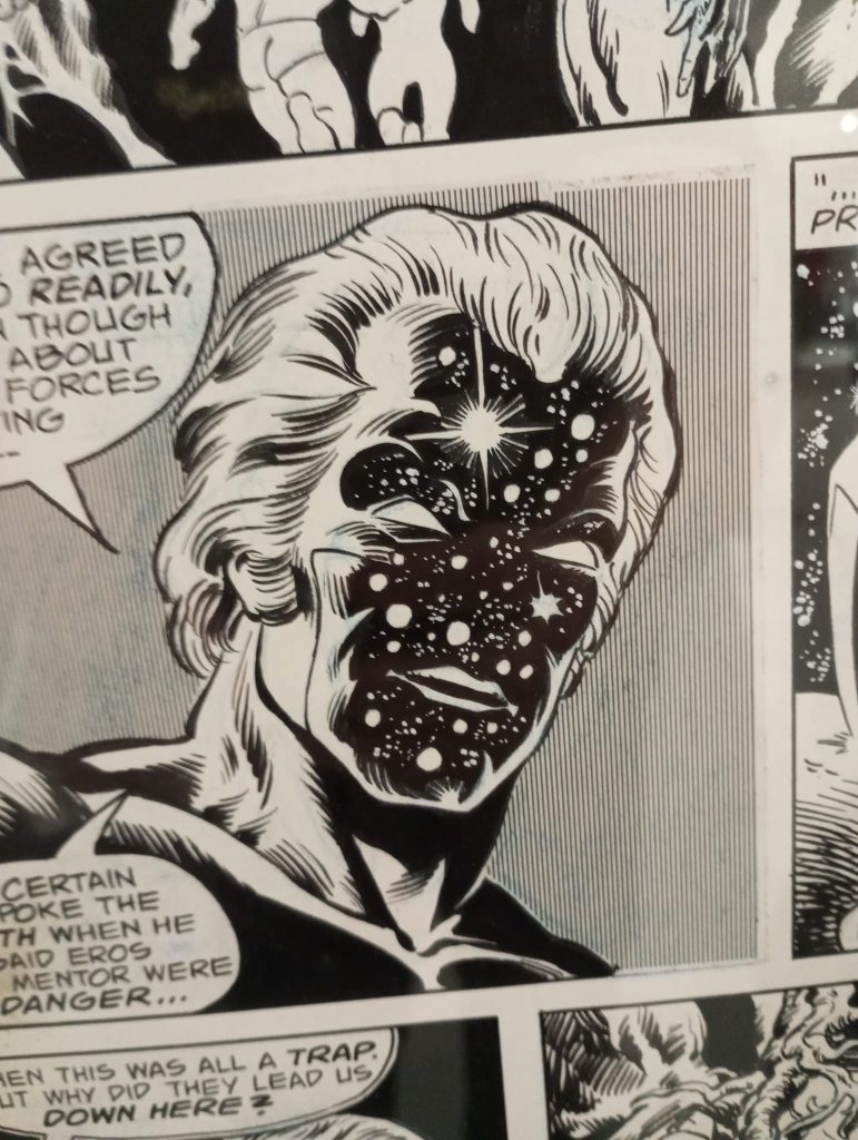 Ces deux derniers mois l’exposition a aussi attiré de nombreux articles très positifs. Mais aussi de très bonnes réactions du public. J’avais composé le parcours en alternant des planches qui correspondent à des « classiques », le genre de choses qui ne peut déclencher que quelques frissons auprès des lecteurs et collectionneurs de longue durée. Mais j’ai aussi sélectionné des pages qui ne sont pas forcément « historiques », qui ne concernent pas des « superstars » des comics mais aussi des gens comme Gray Morrow, Bob Brown ou Dan Adkins… Des pages qui ne sont pas forcément des Avengers, des X-Men pu des Fantastic Four mais aussi de The Cat, de Crystar, ou de Son of Satan, parce que même quand on ne connait pas les personnages concernés les illustrations en question sont explicitement belles et donnent du grain à moudre aussi bien aux vieux de la vieille qu’à des néophytes qui viennent en curieux, certains ne connaissant de Marvel que les films.