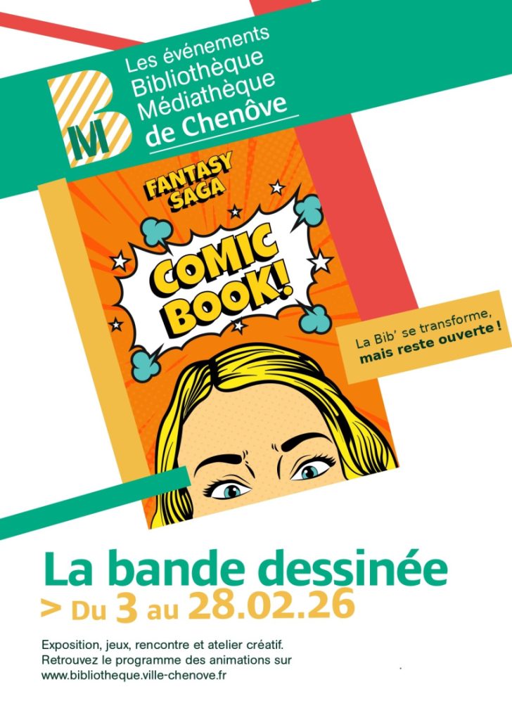 Dans le cadre du mois La Bande Dessinée, je serai de passage à la Bibliothèque–Médiathèque de Chenôve (près de Dijon, en Côte-d’Or) pour une conférence sur les super-héros français, le vendredi 6 février 2026 à partir de 18h30. L’entrée est gratuite, mais il est conseillé de s’inscrire auprès de la médiathèque pour être certain – sait-on jamais – d’avoir une place assise.